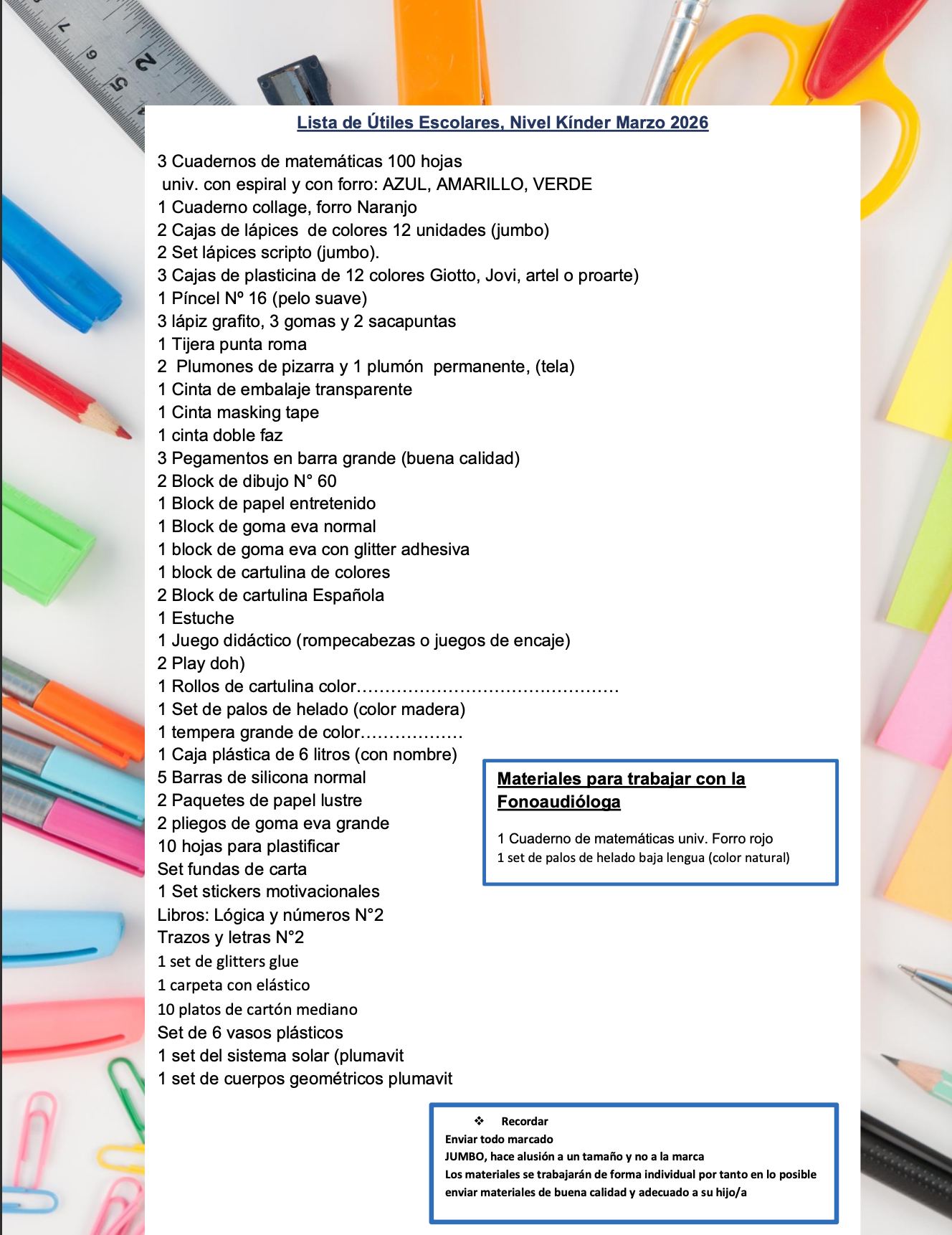 Lista de Utiles Kinder 2026