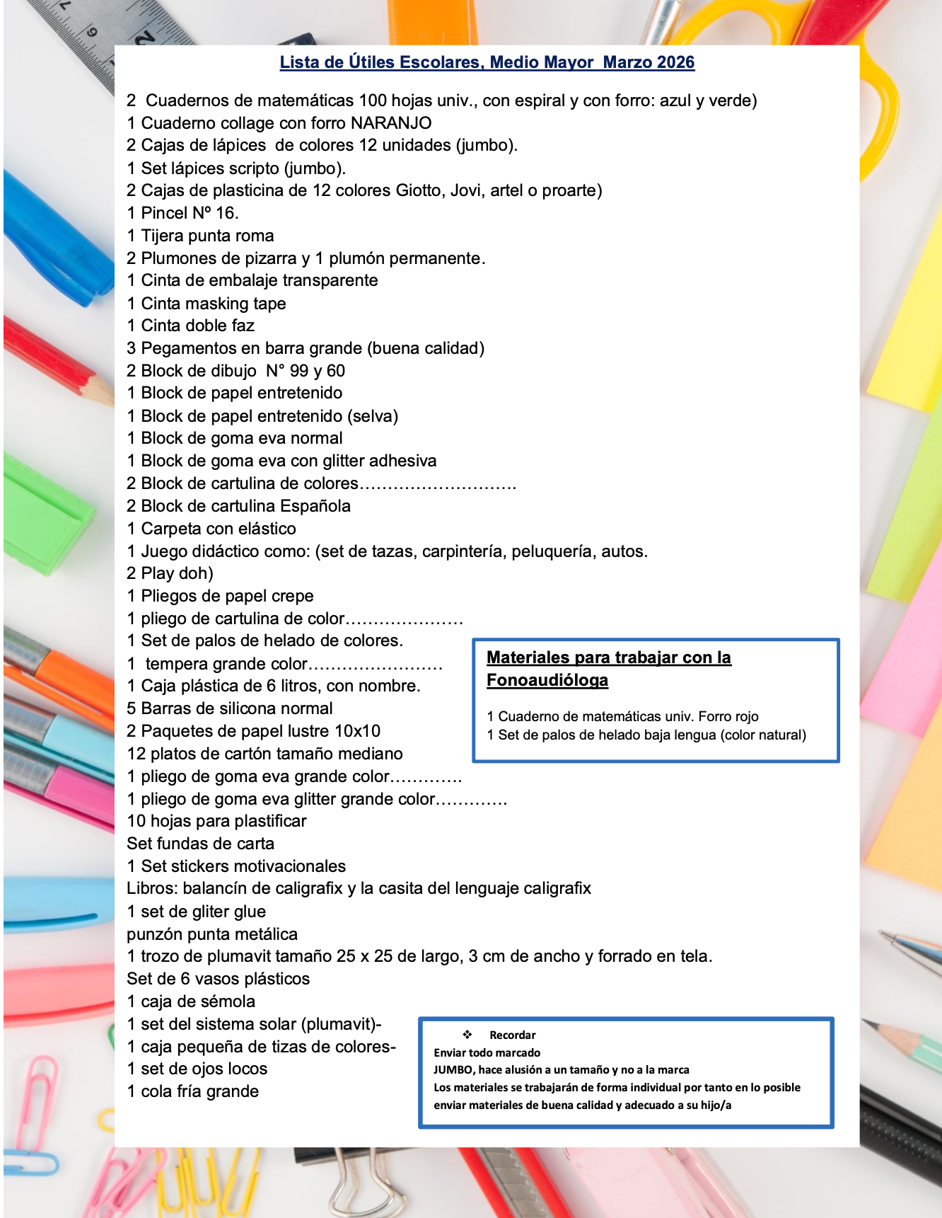 Lista de Utiles Medio Mayor 2026