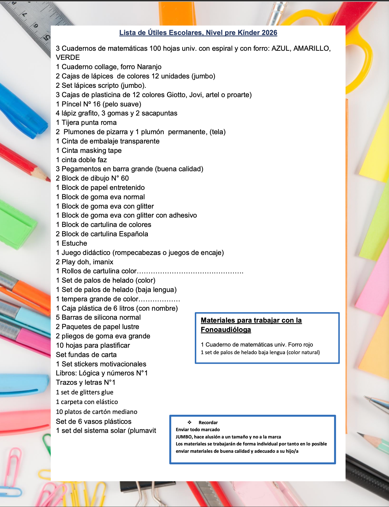 Lista de Utiles Pre-Kinder 2026
